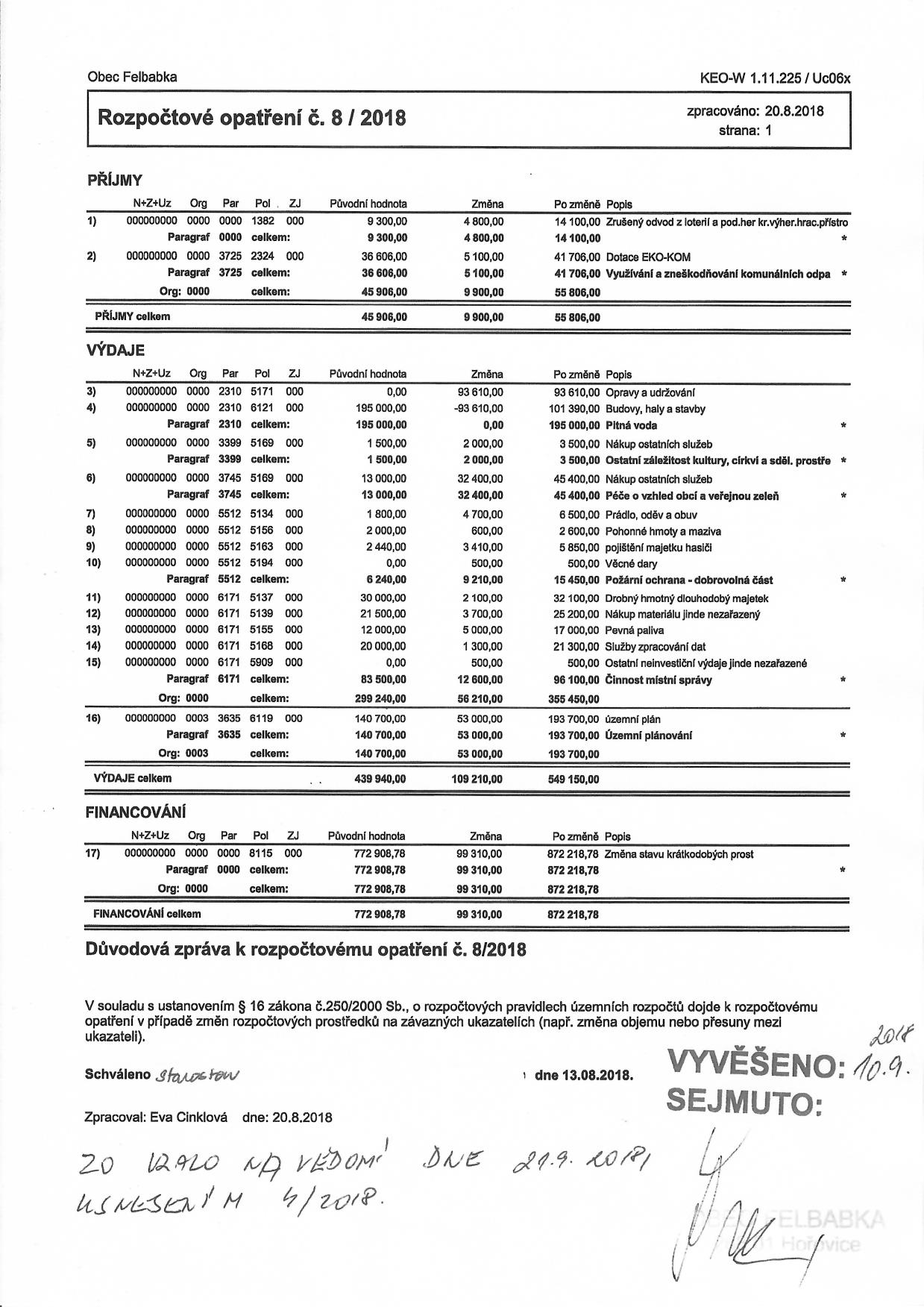 Rozpočtová opatření 2018
