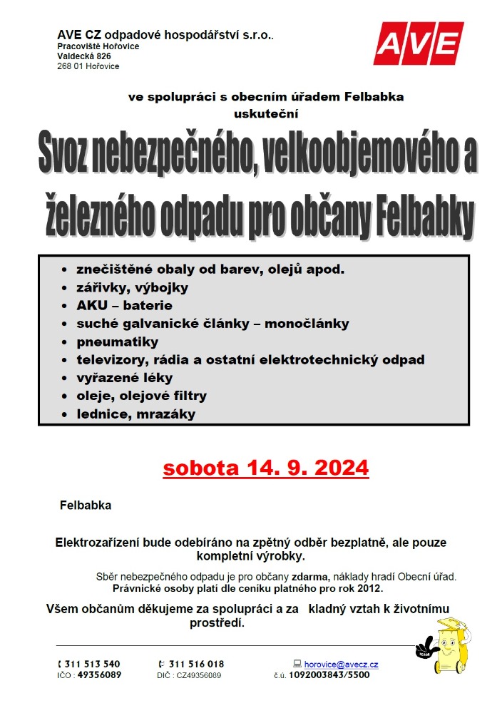 Nebezpečný odpad - leták Přílohy k článku Jméno souboru Popis Velikost odpady.jpg 145 Kb Platný od: 26.8.2024 Aktualizováno: 26.8.2024